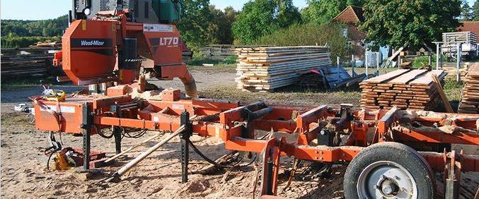 Vi bruger en Wood-mizer LT 70 som er en yderst effektiv sav der saver stammer op til 90 cm. I diameter, og 6,1 m. i længden som standardmål, derudover kan der monteres forlænger så savelængden kommer op på 9,8 m.